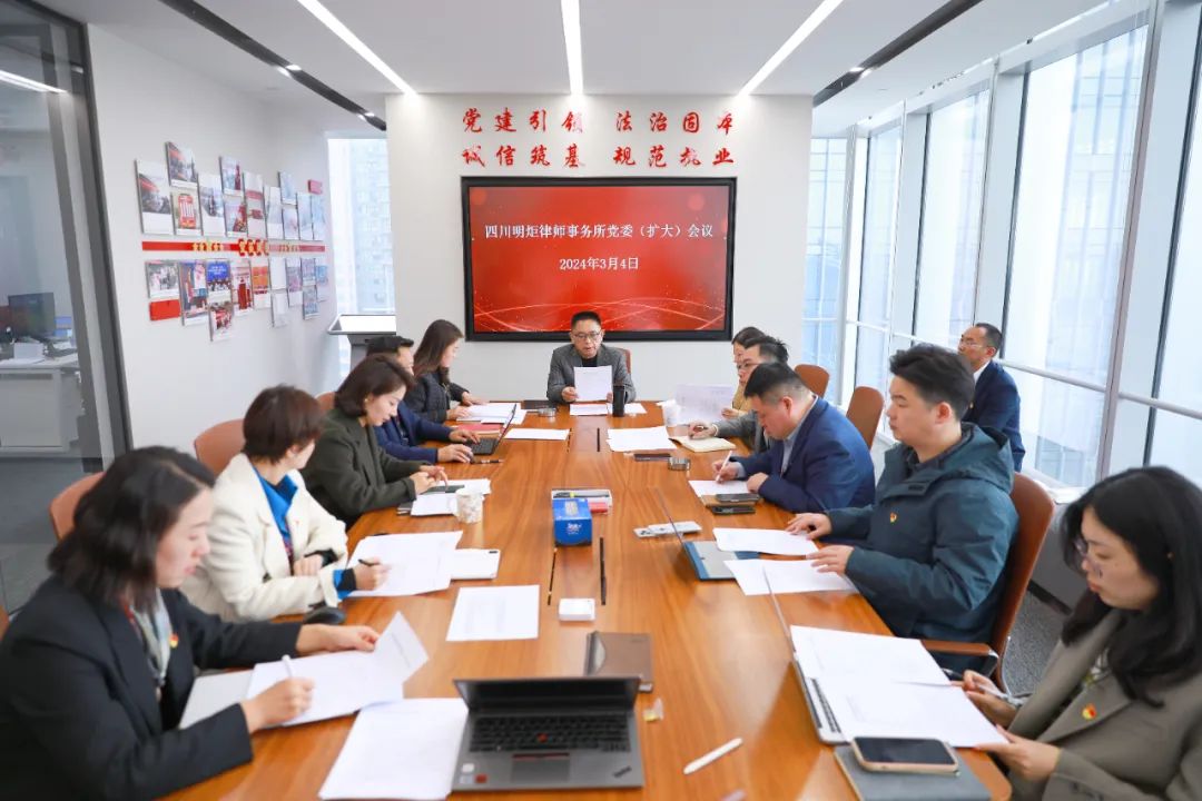 2024年3月4日,四川明炬律师事务所召开2024年第一次党委(扩大)会议,会议由党委书记王宗旗主持,六个党支部书记列席会议。