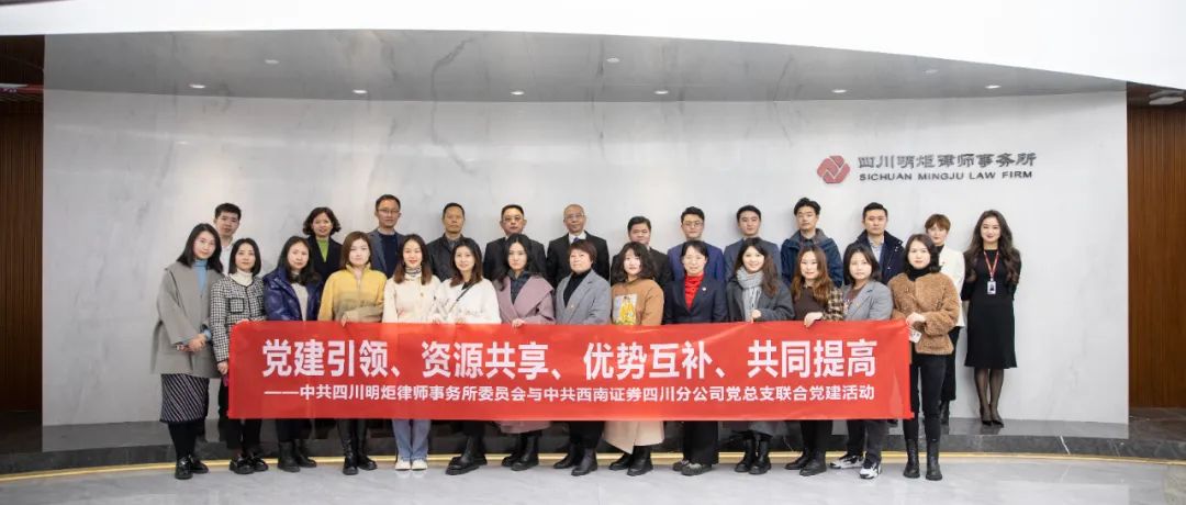 2023年2月9日下午,西南证券四川分公司党总支与四川明炬律师事务所党委在大讲堂举行联合党建日活动。西南证券四川分公司党总支书记、总经理杨道宏,第一支部书记、总经理助理吴雪磊,第二支部书记、云南分公司副总经理胡洪等党政领导及党员同志20余人出席;明炬党委书记、主任王宗旗,党委委员、执委会委员陈霞,第三党支部书记、执委会委员杨勇,第五党支部书记、高级合伙人冯浩,高级合伙人王德波,以及各党支部书记或支委成员、团支部书记、其他支部成员和律师代表等30余人参会。本次联合党建日活动由杨勇主持。