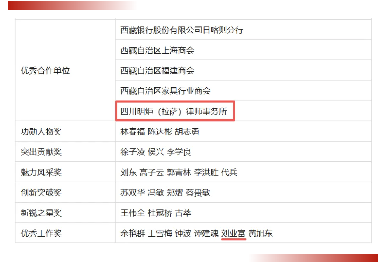 2025年10月18日,“川越天路 藏情永驻”2025全国知名川(渝)商西藏行暨西藏四川商会十二周年庆典在拉萨圆满举行。庆典上,西藏自治区四川商会表彰了为商会发展及西藏建设做出卓越贡献的个人与企业——明炬拉萨分所凭借专业服务与社会贡献获评“优秀合作单位”,分所主任刘业富荣获“优秀工作奖”。