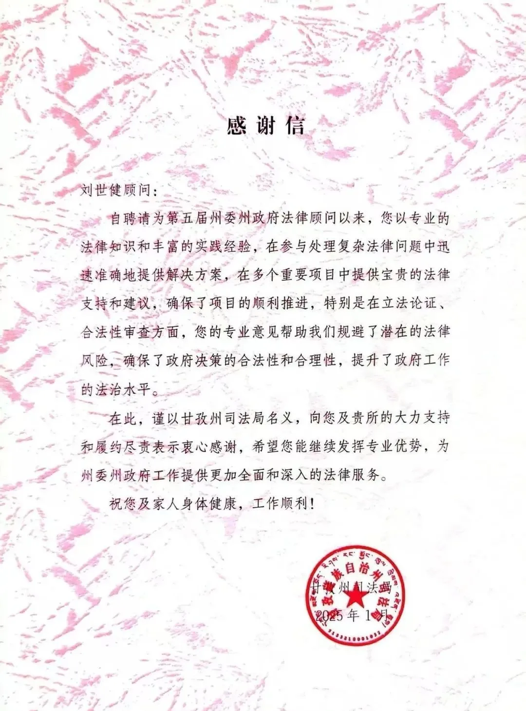 近日,明炬甘孜分所主任刘世健收到甘孜州司法局的感谢信。信中,甘孜州司法局对刘世健自受聘担任第五届州委州政府法律顾问期间的工作给予了高度评价。刘世健凭借深厚的专业法律知识和丰富的实践经验,在面对复杂法律问题时,总能迅速且精准地给出解决方案。在多个重大项目里,他充分发挥专业优势,提供了极具价值的法律支持与建议,有力地保障了项目的顺利推进;在立法论证和合法性审查工作中,刘世健的专业意见也发挥了积极作用,为推动政府工作法治水平的提升履行了一名法律顾问应尽的职责。