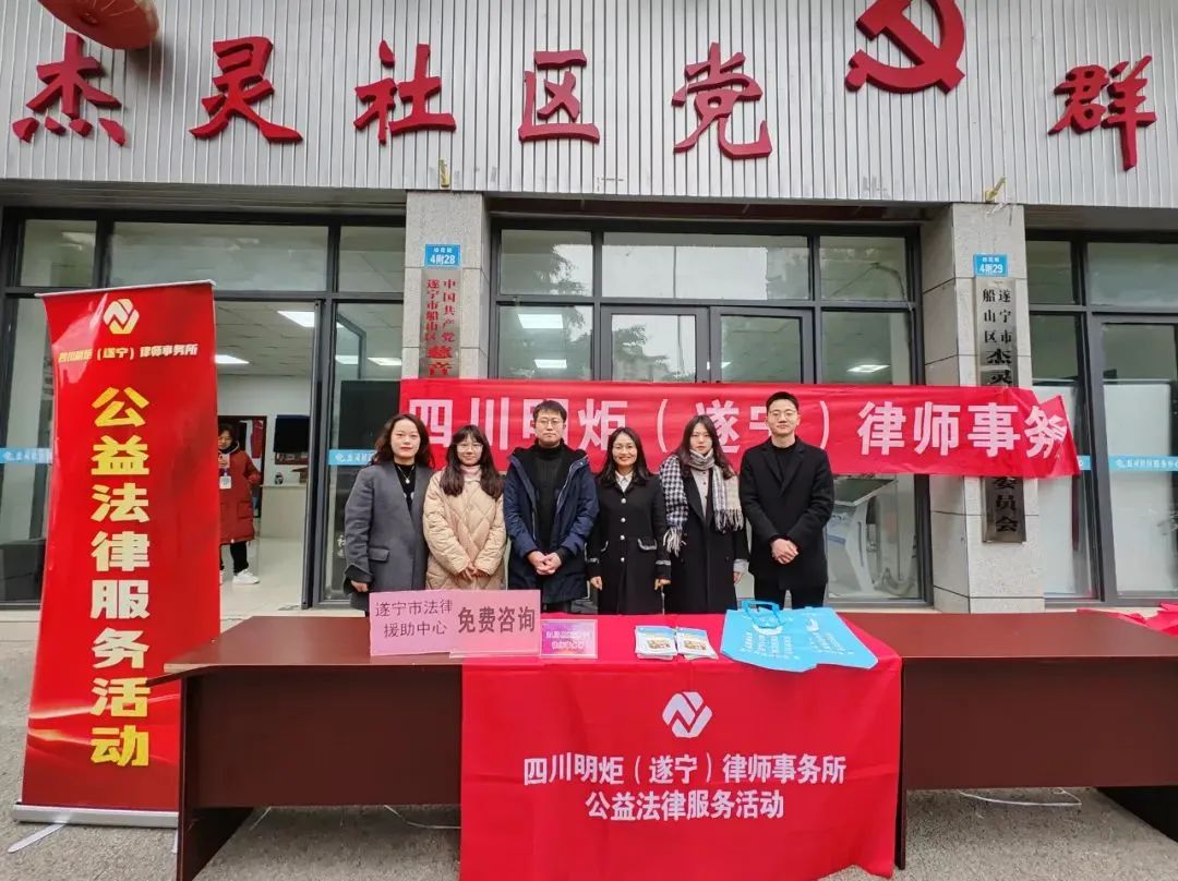 为弘扬法治文化,营造法治氛围,2024年1月31日上午,明炬遂宁分所走进杰灵社区,开展2024年新春公益法律服务进社区活动。