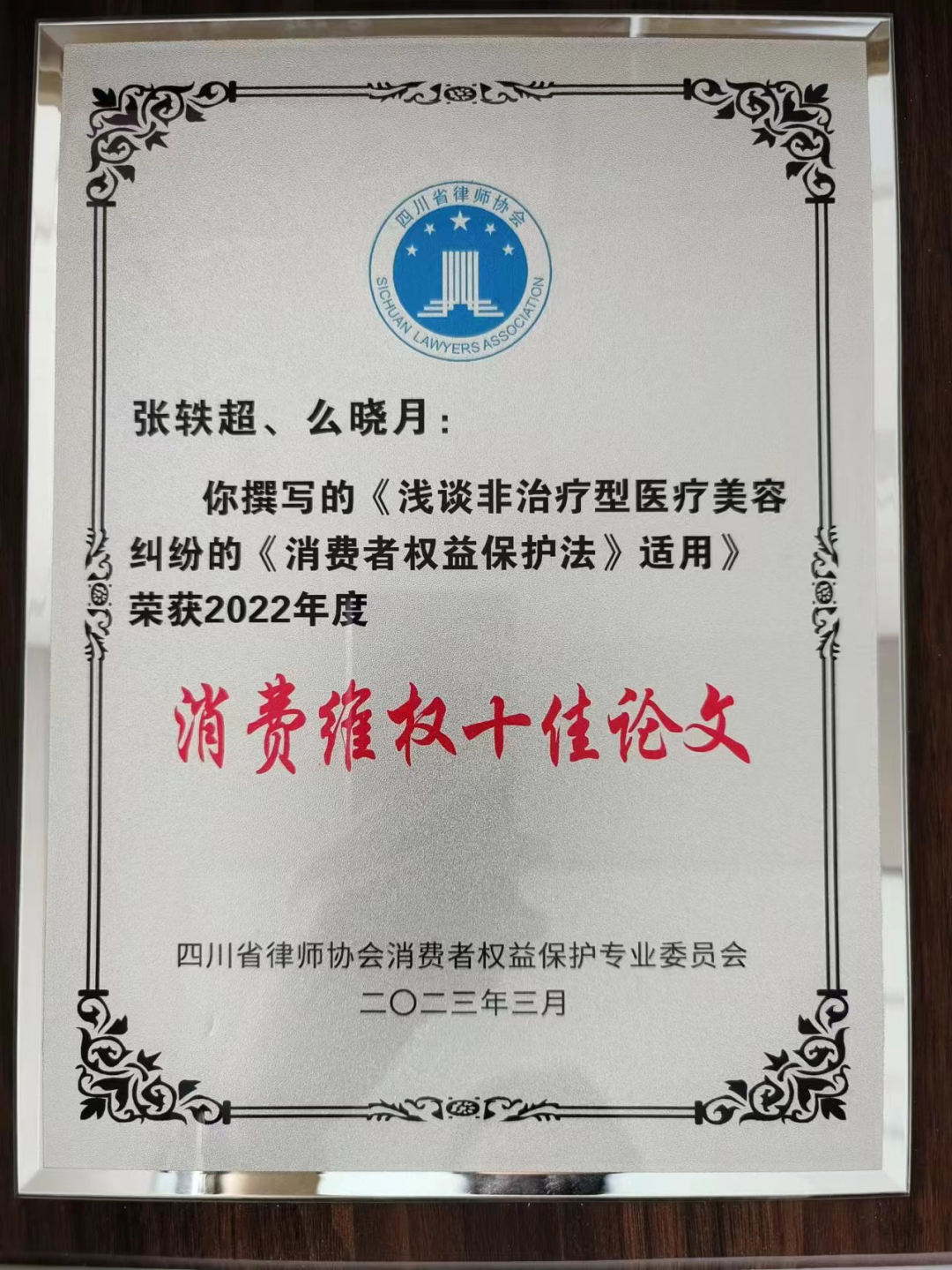 2023年3月11日,四川省律师协会消费者权益保护专业委员会在西南财经大学法学院举办了“2022年四川律师消费维权‘十佳论文’‘十佳案例’颁奖暨消费维权疑难问题辨析会”。四川省律师协会消费者权益保护专业委员会委员、明炬合伙人张轶超律师和明炬食品医药大健康业务部么晓月律师共同撰写的《浅谈非治疗型医疗美容纠纷的<消费者权益保护法>适用》荣获“消费维权十佳论文”奖。