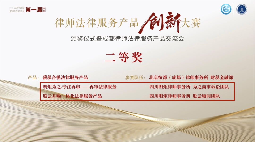 2023年3月15日,第一届成都律师法律服务产品创新大赛颁奖仪式暨成都律师法律服务产品交流会圆满落幕。本次大赛于2021年11月启动,51家律所、107件法律产品激烈角逐,经过评委综合评议,评选出20名优秀奖、6名三等奖、3名二等奖,1名一等奖,其中,明炬有6件法律产品在大赛中分别获得二等奖、三等奖和优秀奖。