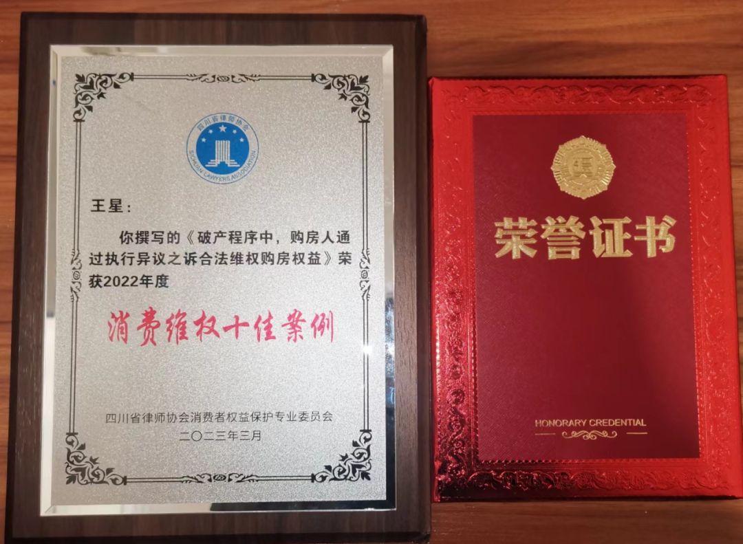 2023年3月,四川省律师协会消费者权益保护专业委员会在西南财经大学法学院举办了“2022年四川律师消费维权‘十佳论文’‘十佳案例’颁奖暨消费维权疑难问题辨析会”。明炬王星律师代理的执行异议之诉案件荣获“消费维权十佳案例”奖。