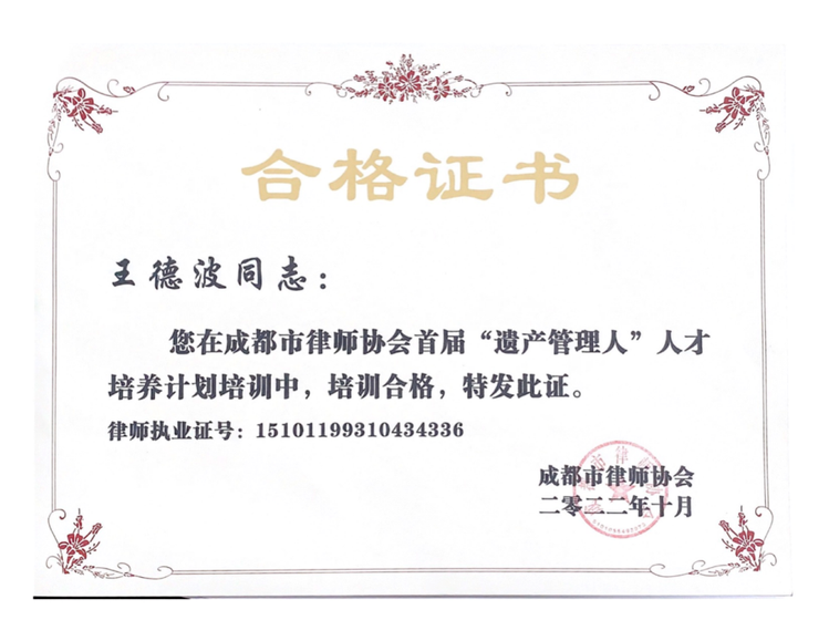 为更好体现律师提供遗产管理人服务的专业优势与专业价值,成都市律师协会于2022年开展了首批“遗产管理人”人才培养计划,经律师个人申报、资格初审、培训考核及会长办公会审议等程序,我所张承凤、王德波、白新群、袁霞、胡智超、邓晨曦共6名律师荣获成都市律协首届“遗产管理人”人才培训合格证书。