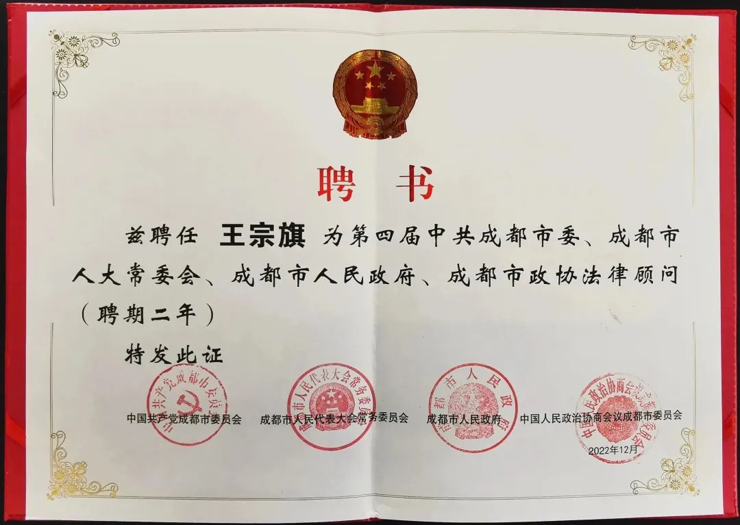 2022年12月,中共成都市委、成都市人大常委会、成都市人民政府、成都市政协联合发文,公布了第四届法律顾问团成员名单,成都市律师协会会长、四川明炬律师事务所主任王宗旗第四次获聘中共成都市委、市人大常委会、市政府、市政协法律顾问。