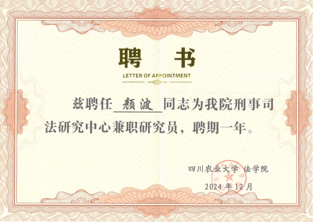 近日,明炬高级合伙人、管委会委员颜波被四川农业大学法学院聘为刑事司法研究中心兼职研究员,聘期一年;合伙人、执委会委员张杨被四川农业大学法学院聘为法治社会研究创新协同中心专家顾问,聘期一年;合伙人王松律师、孙军、舒天翊被四川农业大学法学院聘为本科生校外导师,聘期一年。
