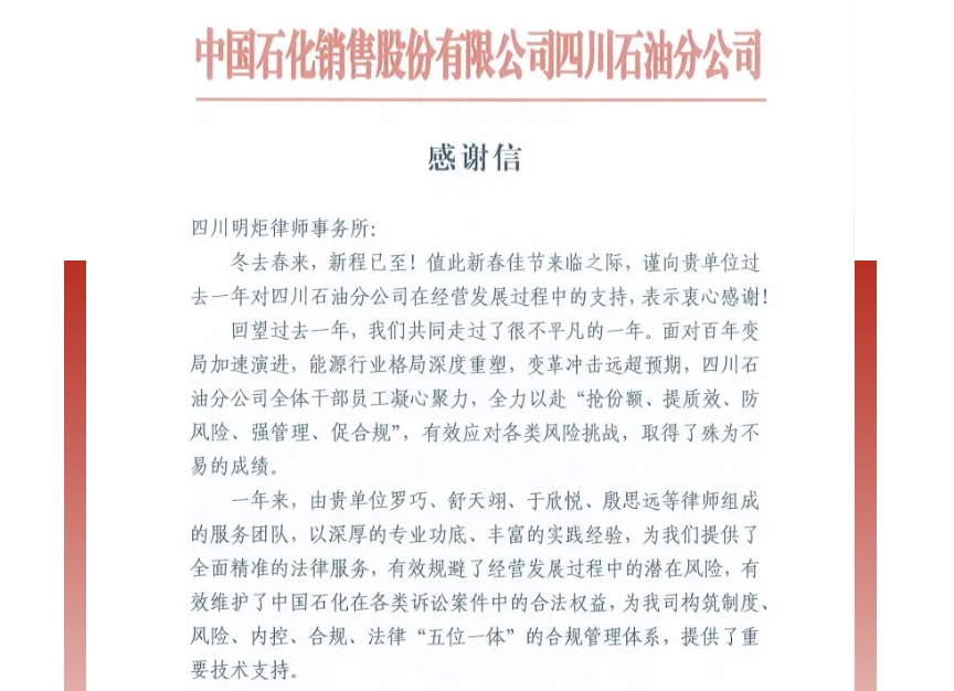 近日,四川明炬律师事务所收到中国石化销售股份有限公司四川石油分公司发来的感谢信,客户对明炬过去一年提供的专业法律服务及成效给予高度肯定与诚挚感谢。