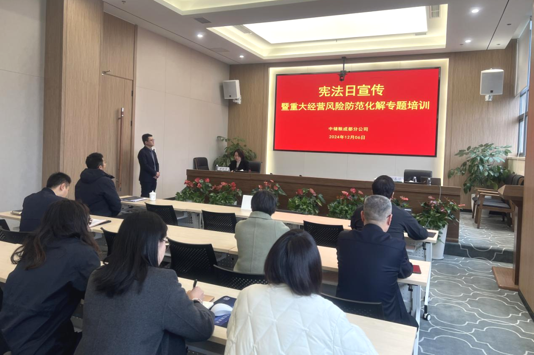 2024年12月6日,应中国储备粮管理集团有限公司成都分公司邀请,明炬党委委员、高级合伙人胡基洋为该司本部及下辖19家直属库公司线上线下千余名干部职工开展“宪法日宣传暨重大经营风险防范之合同风险防范”专题讲座。中储粮成都分公司纪委书记张伟、各处室负责人及下辖各直属库公司领导班子参与了本次培训。