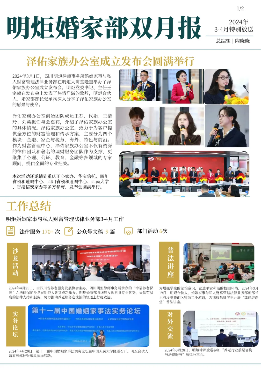 为总结部门工作,宣传部门活动,推动部门发展,明炬婚姻家事与私人财富管理法律业务部特别推出《明炬婚家部双月报》,期待更多同仁对婚姻家事与私人财富管理法律业务部有更深入的了解、更直接的交流和更广泛的合作。