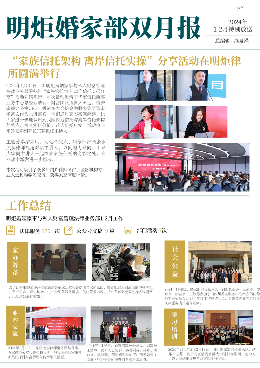 为总结部门工作,宣传部门活动,推动部门发展,明炬婚姻家事与私人财富管理法律业务部特别推出《明炬婚家部双月报》,期待更多同仁对婚姻家事与私人财富管理法律业务部有更深入的了解、更直接的交流和更广泛的合作。