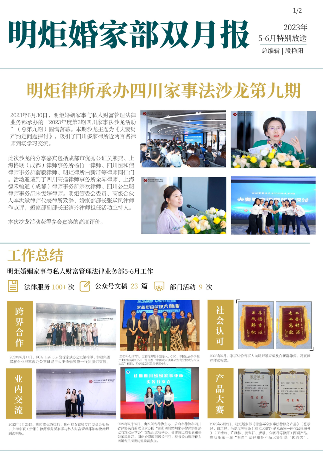 为了更好地开展工作,提升部门行动力,明炬婚姻家事与私人财富管理法律业务部特推出《明炬婚家部双月报》,以此来总结部门工作,展示部门活动,推动部门发展。并寄希望于更多同仁愿意对明炬婚姻家事与私人财富管理法律业务部有更多了解、参与及合作。