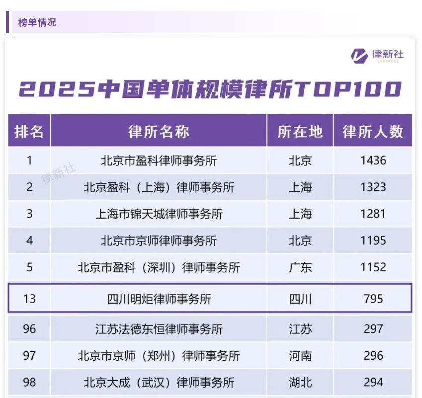 明炬荣登律新社“2025中国单体规模律所TOP100”榜单