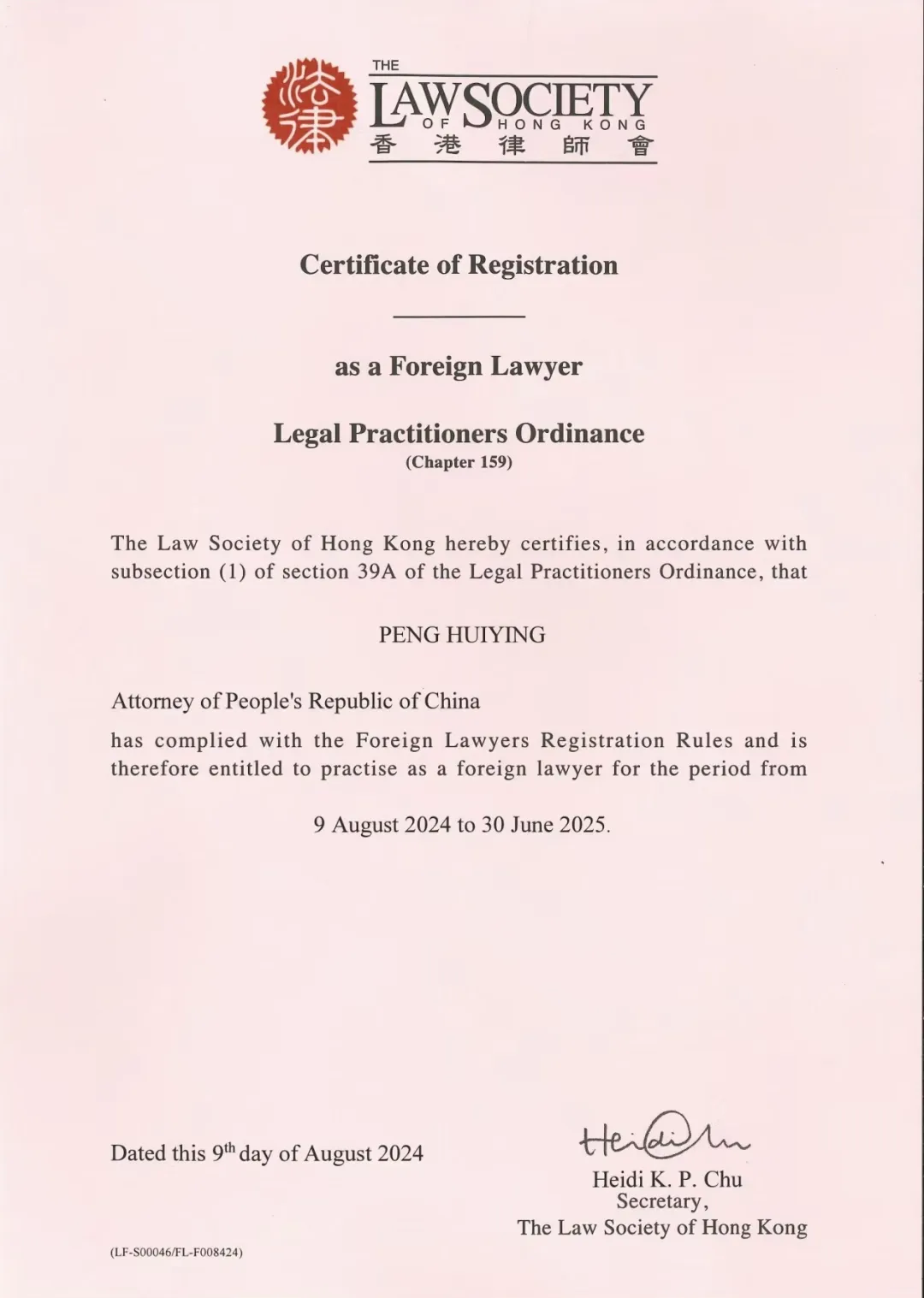 祝贺!彭慧英律师获批成为香港注册外地律师