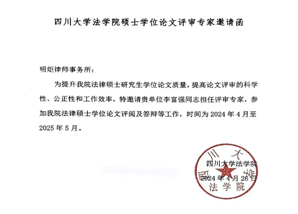 高级合伙人李富强应邀成为四川大学法学院硕士学位论文评审专家