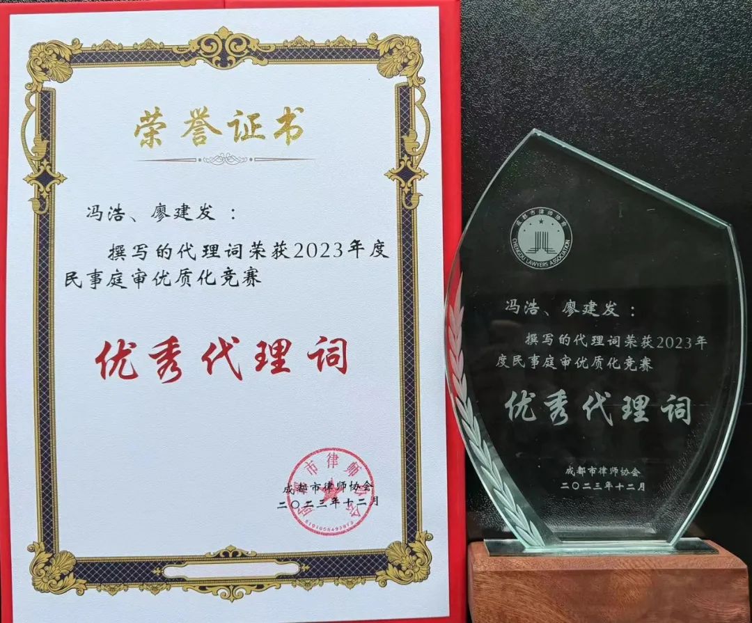 冯浩、廖建发律师荣获2023年度成都民事庭审优质化竞赛“优秀代理词”