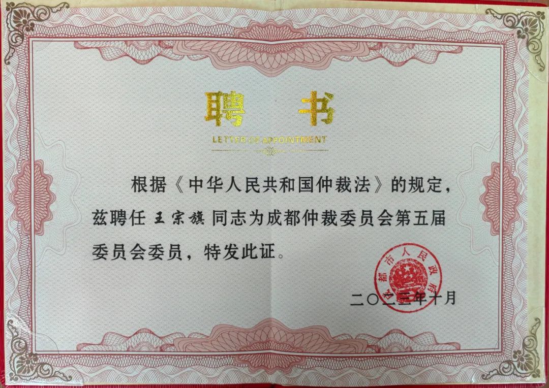 祝贺!王宗旗主任被成都市人民政府续聘为第五届成都仲裁委员会委员