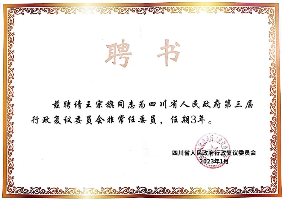 王宗旗主任续聘为四川省人民政府第三届行政复议委员会非常任委员