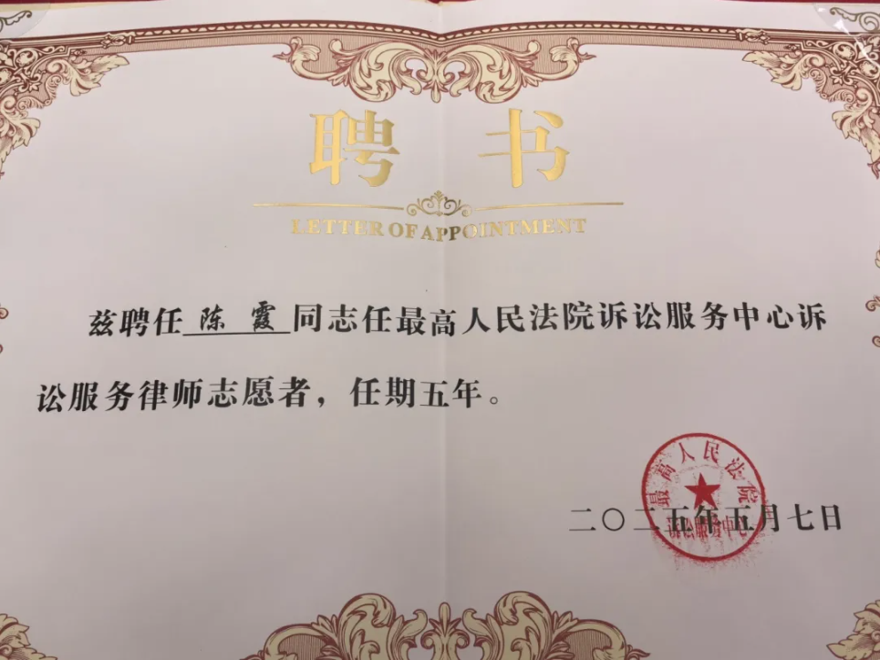 陈霞、何亚林分别获聘最高人民法院诉讼服务律师志愿者、专家志愿者