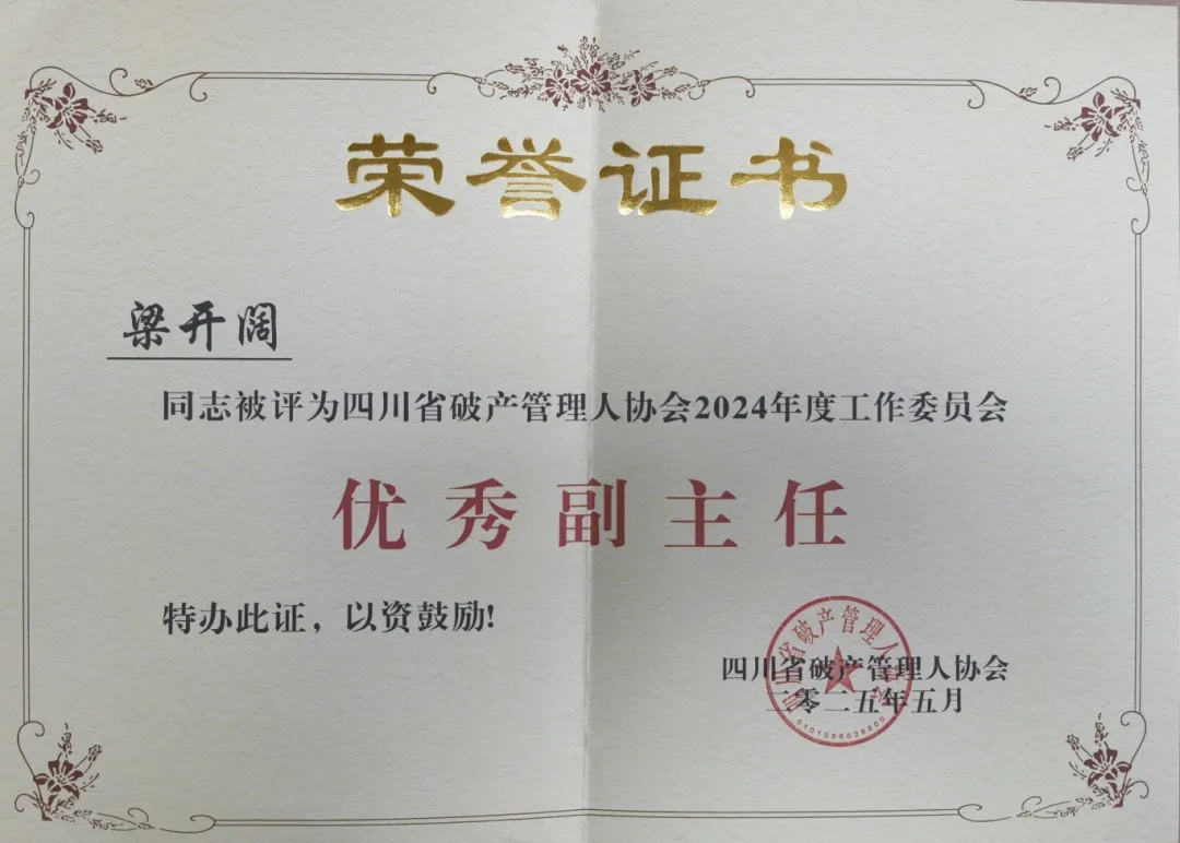 梁开阔律师获评四川省破产管理人协会“2024年度工作委员会优秀副主任”